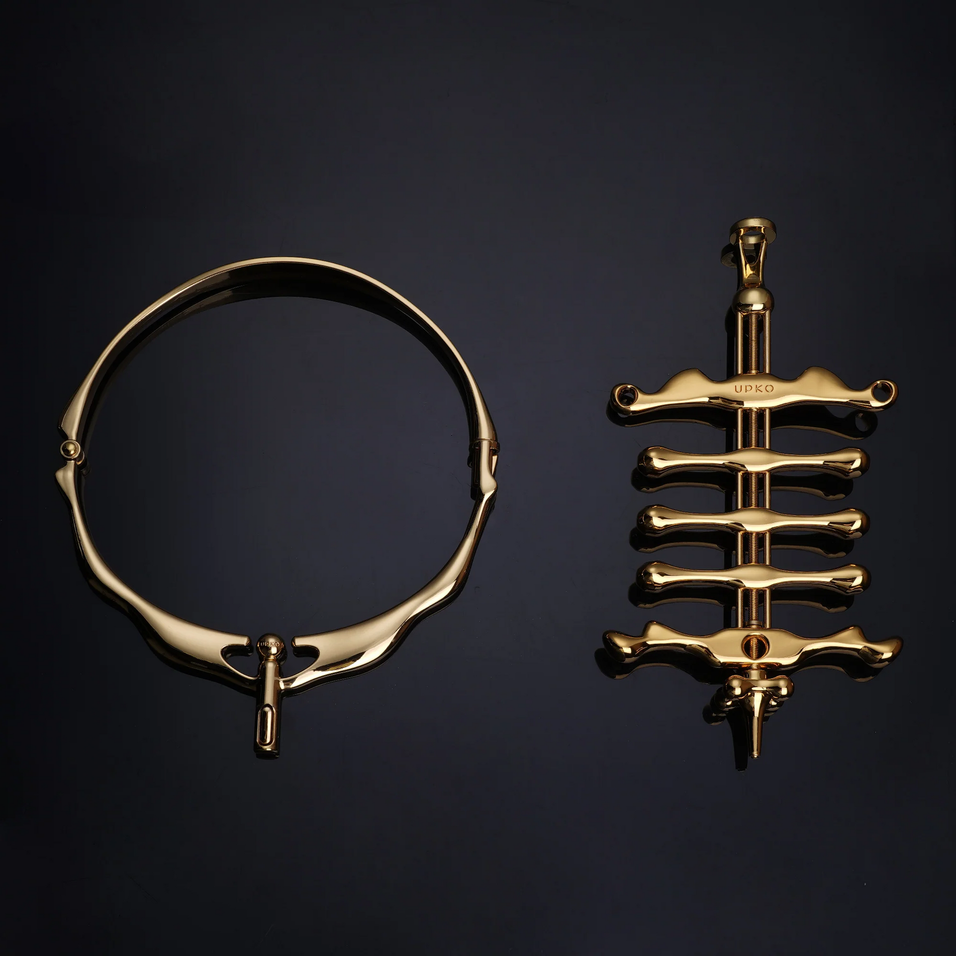 The Aurum Embrace Collar and Finger Restraint is a one-of-a-kind bondage accessory that transcends the ordinary, blending avant-garde design with exquisite craftsmanship.