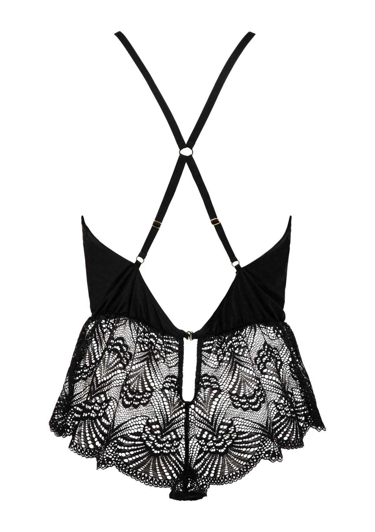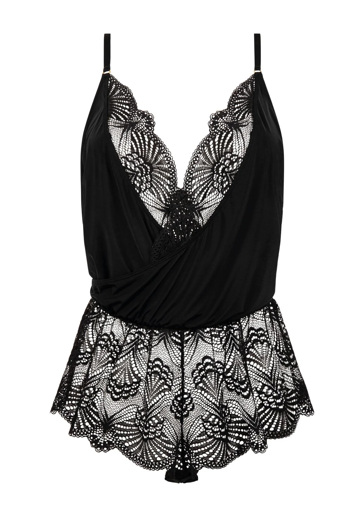 Enlace Moi Teddy. This soft, sexy teddy is worn with dreamlike comfort. Pretty spaghetti cord straps with gold tips slip into jewel loops for an elegant finish. The lacey shorts offer an erotic peek-a-boo style visual of your lower half. Converts into a waist cincher thanks to the removable garters.