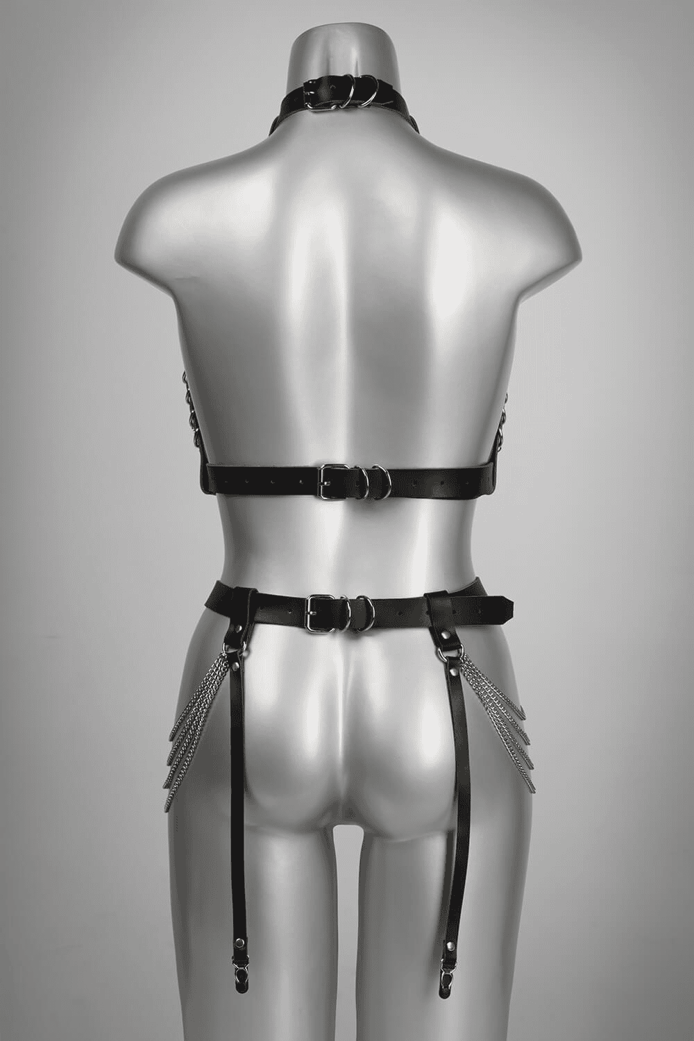 This leather garter belt puts you at the center of attention at an erotic party or during an exciting night at home. Combine with the matching harness to complete your kinky lingerie look.