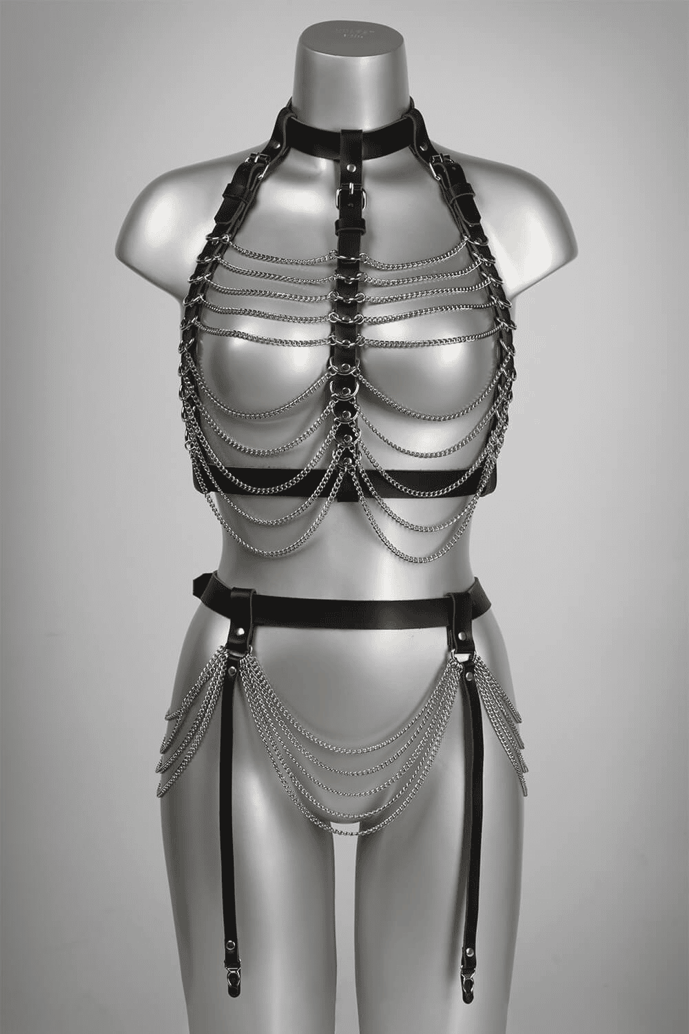 Fascinate Leather Chain Garter Belt. Exclusively designed by Voyeur X, this chain garter belt is handmade from first-class Portuguese leather that is pressed in a way to rest against your body with comfort in mind. Silver-coloured chains sensually fall over your hips and captivate your audience. Transform the leather garter into a sexy belt by unclipping the garter straps.