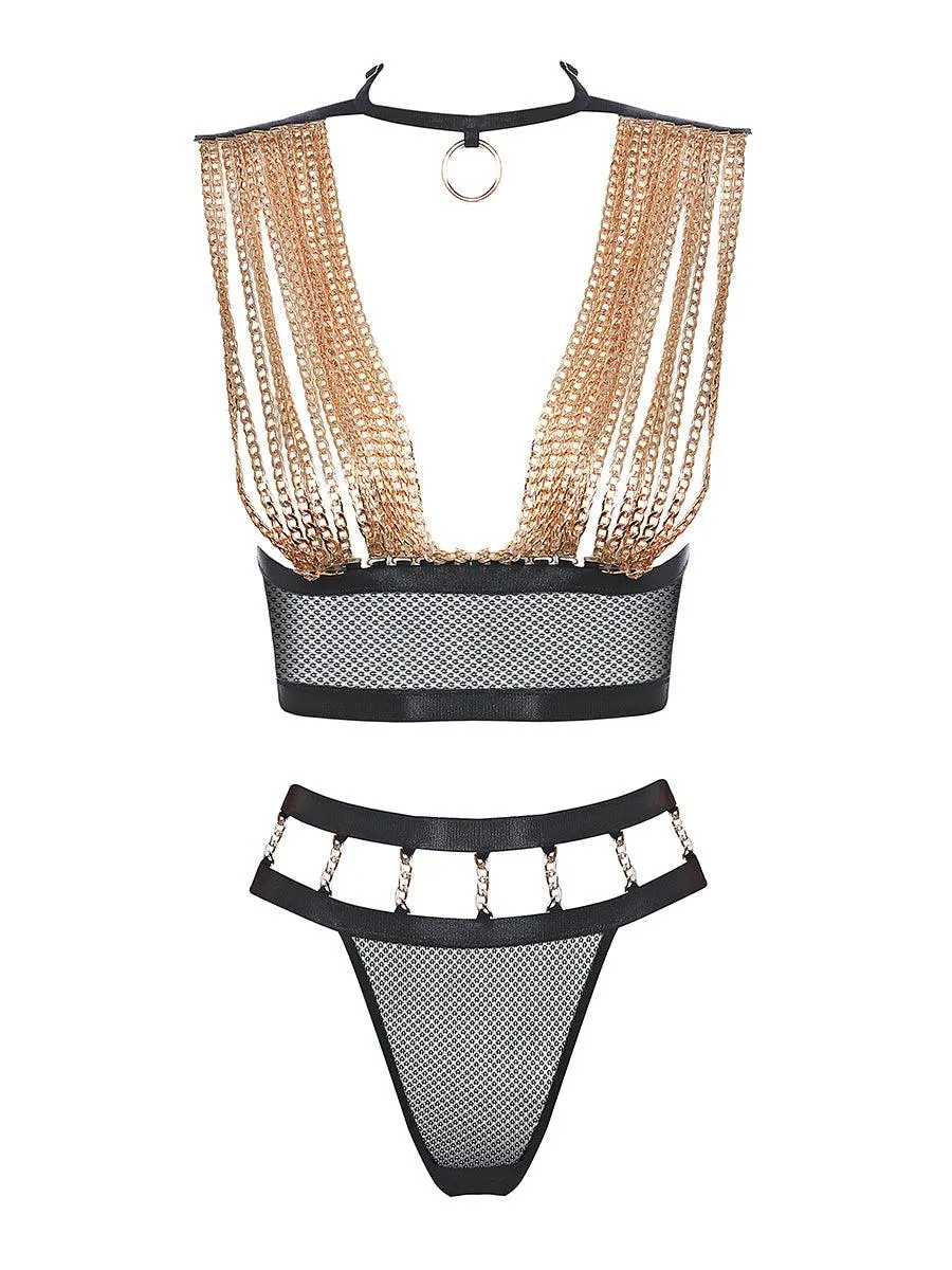 The rich black mesh and sleek straps caress your figure, while opulent gold fittings and chains accentuate every curve, creating a look that exudes luxury and strength. This set captures the essence of a woman who is a force of nature—infinitely strong, unapologetically bold, and irresistibly captivating.