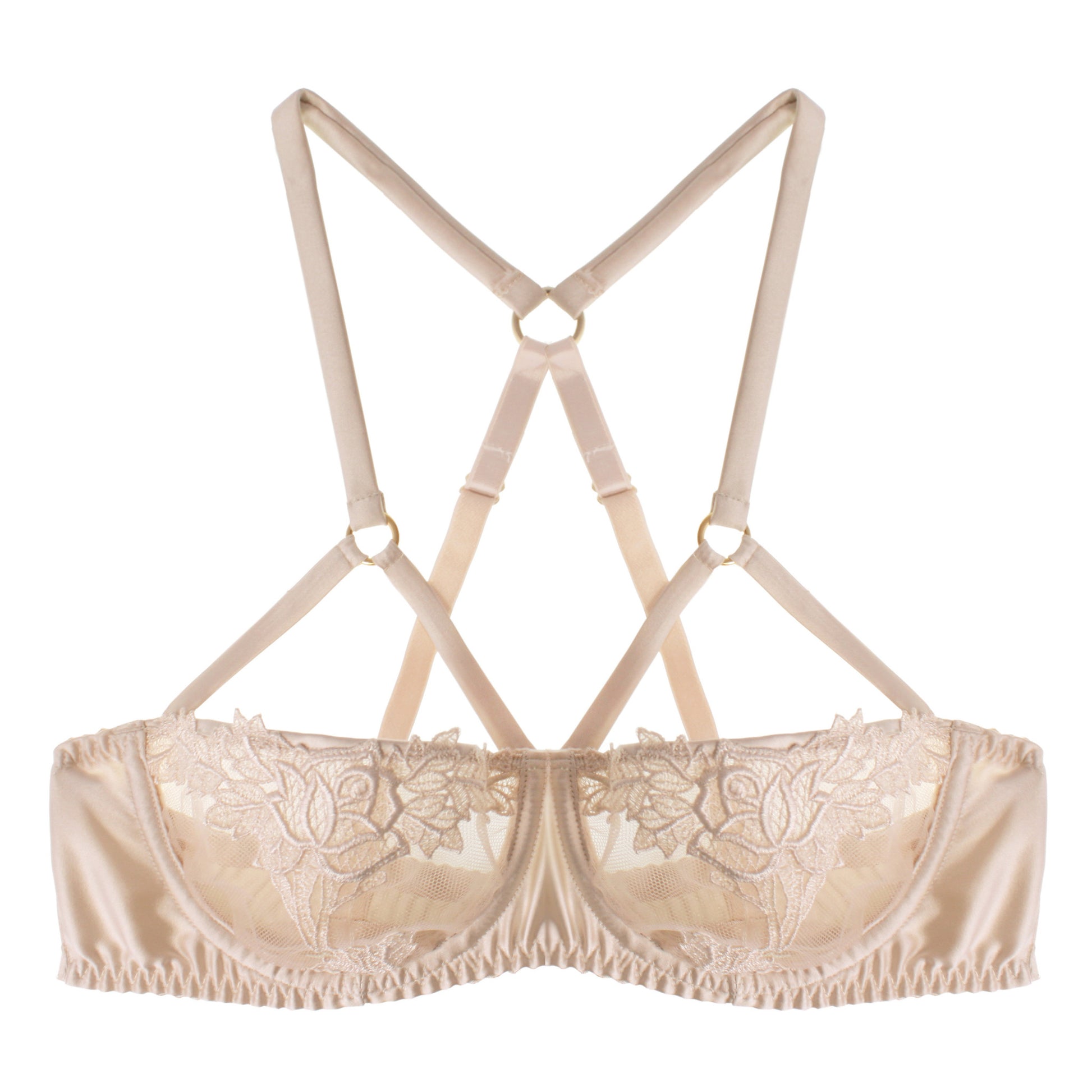 Golden Hour Strappy Balcony Bra. Capture the magical, romantic feeling of "golden hour". Inspired by the natural light that occurs just before sunset, this breathtaking bra comes in a sumptuous white-cream and features sheer Italian tulle and sophisticated bespoke embroidery. The double satin-wrapped straps frame the bust and feel sensually soft against the skin. Effortlessly comfortable and supportive, the Golden Hour Strappy Balcony Bra has adjustable straps in a racer-back style and a classic hook-and-eye back closure. 18 karat gold sliders and O-rings add an extra touch of luxury to this already stunning piece.