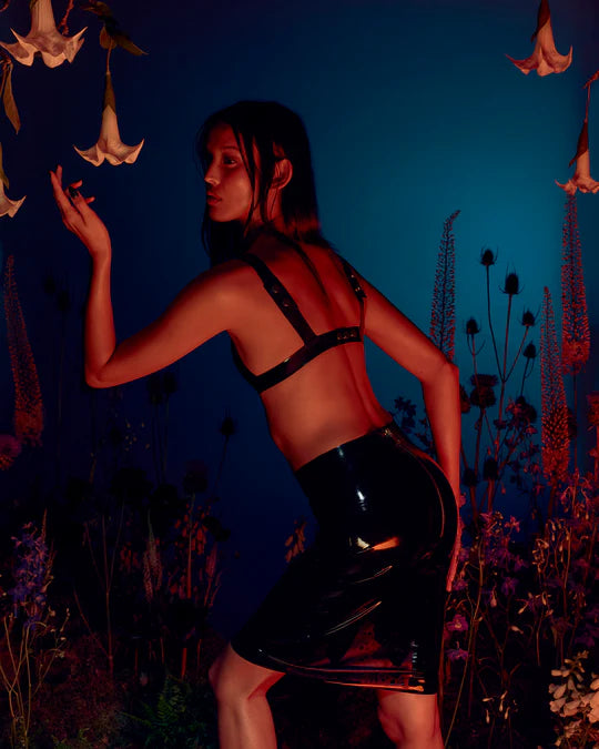 A luxe gold-tone zip provides a flawless finish at the rear, adding a touch of glamour to its minimalist design. Wear it as the centerpiece of your outfit or create a truly magnetic ensemble by pairing it with the coordinating latex bra and latex stockings.