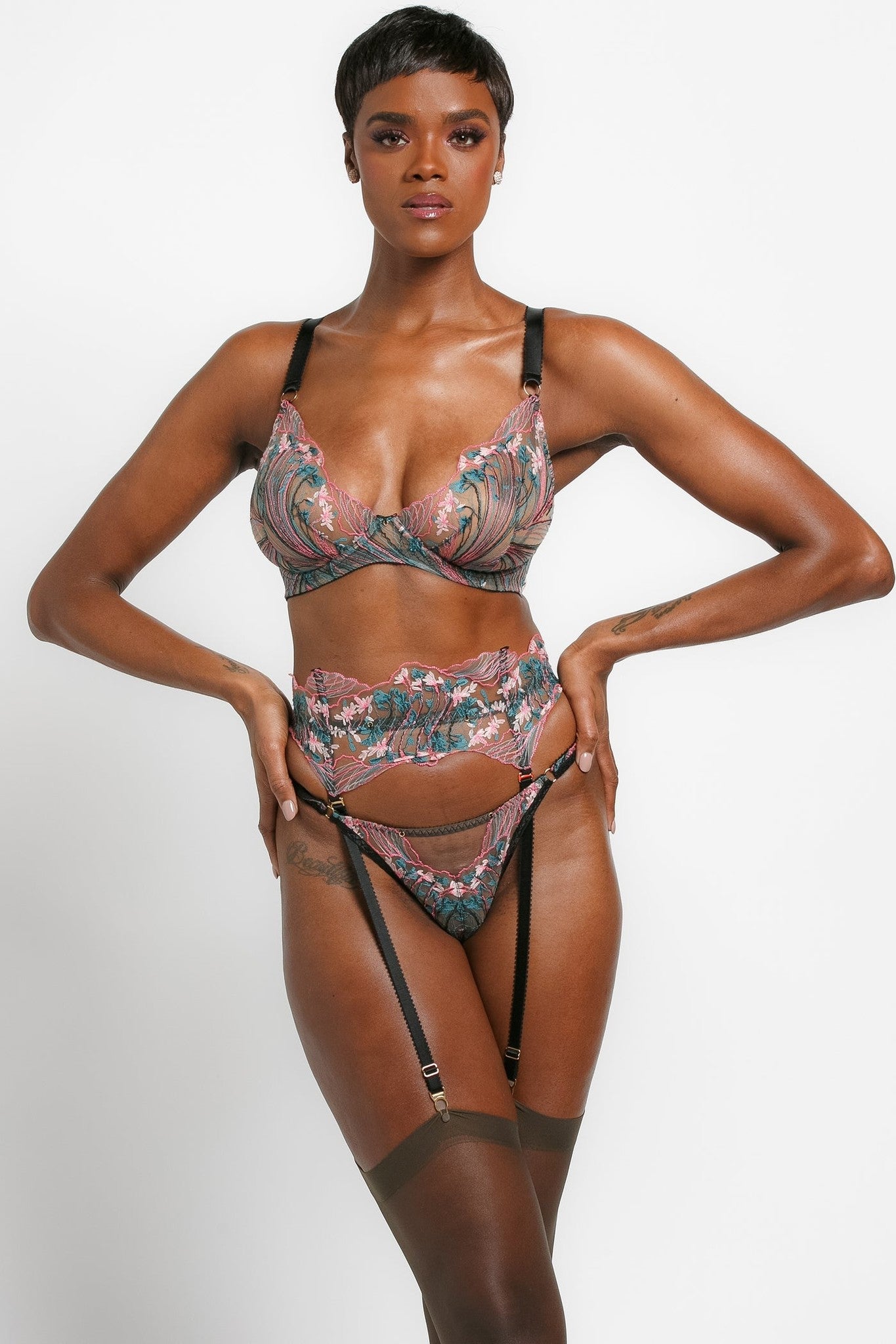 Rejoice in romance in the ethereal, unparalleled Edge O'Beyond Libby Bra. Her bespoke French embroidery in teal and candy pink tones tease and captivate. Reminiscent of wildflower meadows, her delicate scallops kiss and caress your curves. Libby transports you to a midsummer night’s dream you won’t want to wake up from; this is a bra that sings Forget-Me-Not.