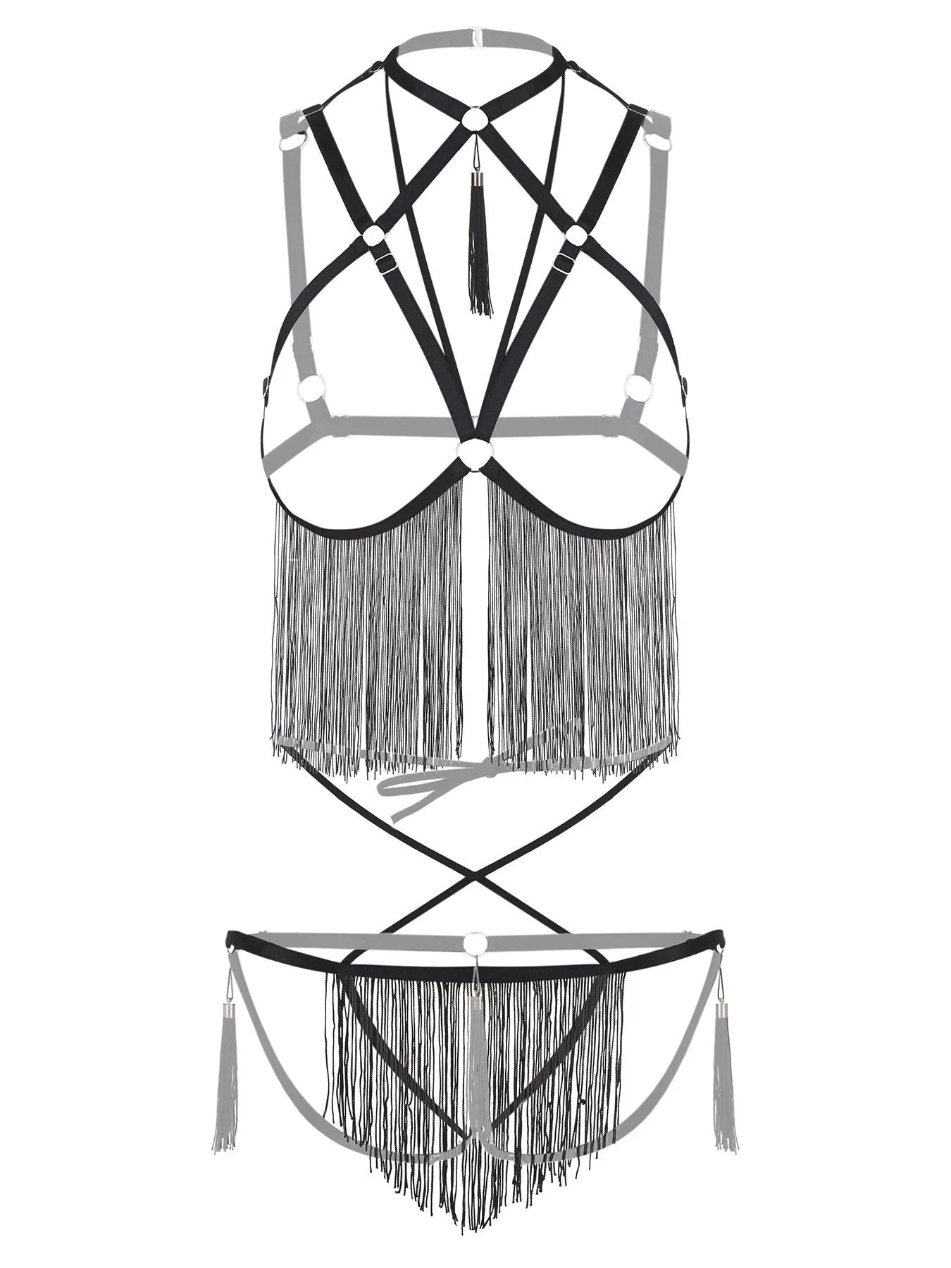 Tassel adornments add an alluring sense of whimsy and movement, while thin, sensual straps connected by metal rings at the neck and chest create a striking pattern across your body. Crafted from skin-friendly, durable materials, this set offers both comfort and longevity, making it perfect for exploring your seductive side. The shimmering fringe adds a touch of mystery, completing this luxurious set for those ready to embrace their inner temptress. The adjustable sizing and elastic elements ensure a perfect fit for any body type.