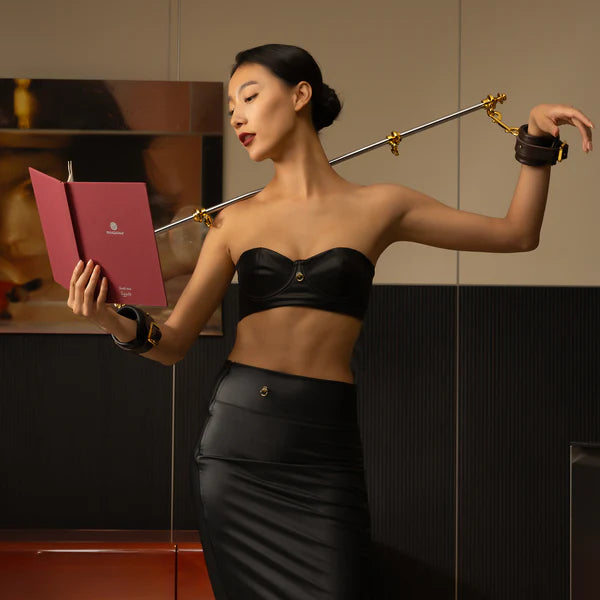 With the hands cuffed to the rigid rod behind the body, movement is further restricted while the hips are subtly lifted and accentuated. During spanking, the upper body must remain upright and composed, heightening both vulnerability and irresistible allure.