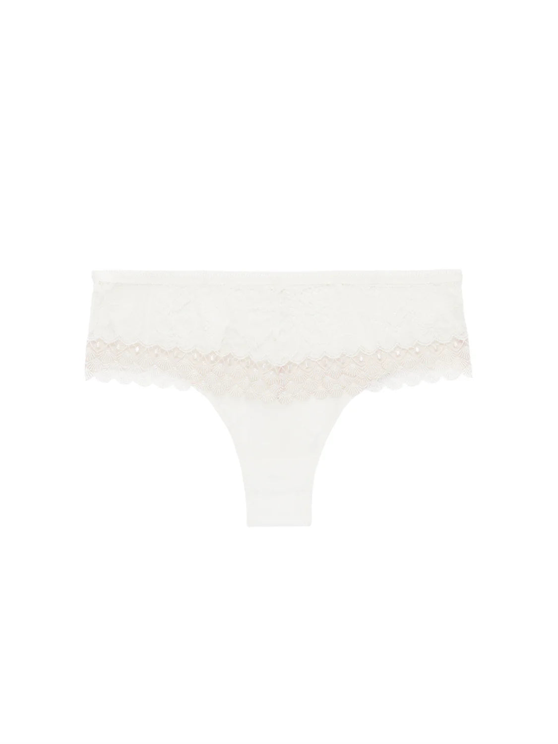 The front panel showcases a vintage-feel lace and delicate embroidery finished with beautiful scalloped edges for a highly feminine and art deco look. Turn it around to reveal a smooth, comfortable knitted fabric back featuring clean-cut finishes, specifically designed to ensure completely invisible wear under any clothing. For ultimate daily comfort, the piece is securely finished with a breathable, 100% cotton gusset.