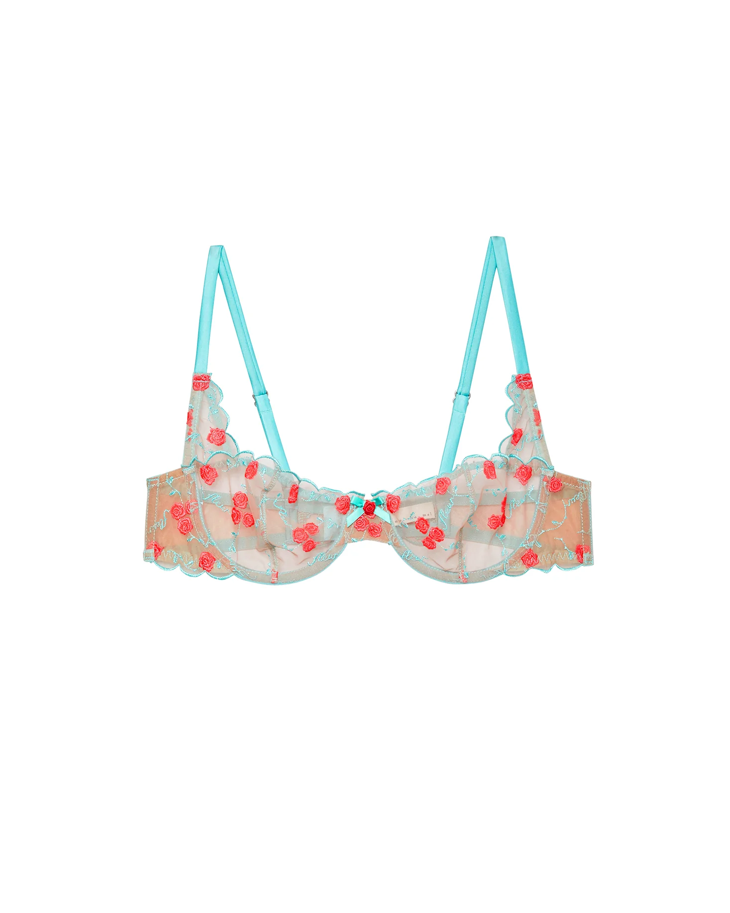 This exquisite teal piece is adorned with custom embroidery and the iconic Fleur du Mal logo script on sheer tulle. Adjustable silk-covered staps rest delicately on the shoulders, while captivating cerise rosettes strikingly accent the ultra-flirty scalloped cups. Sitting perfectly in the middle is a classic silk bow, the perfect finishing touch to this dreamy bra.