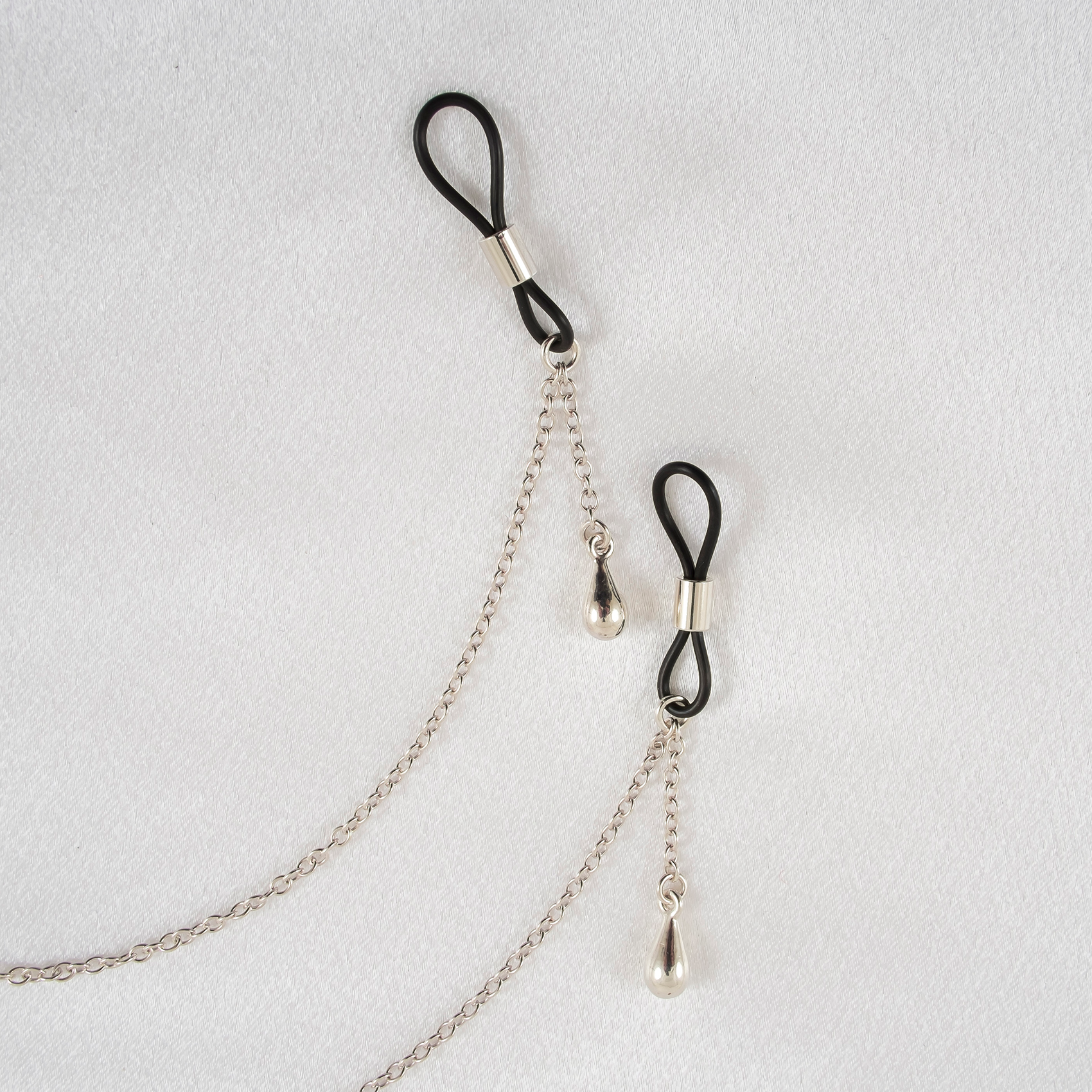 The shimmering necklace extends to 22 inches, with 8-inch silver extensions leading to soft rubber nipple cords- completely non-piercing and fully adjustable. These silver noose-style rings offer a sensual and painless hold, embracing all nipple diameters with gentle pressure. Each movement awakens the senses as the dangling chains and pendants brush the skin with every breath.