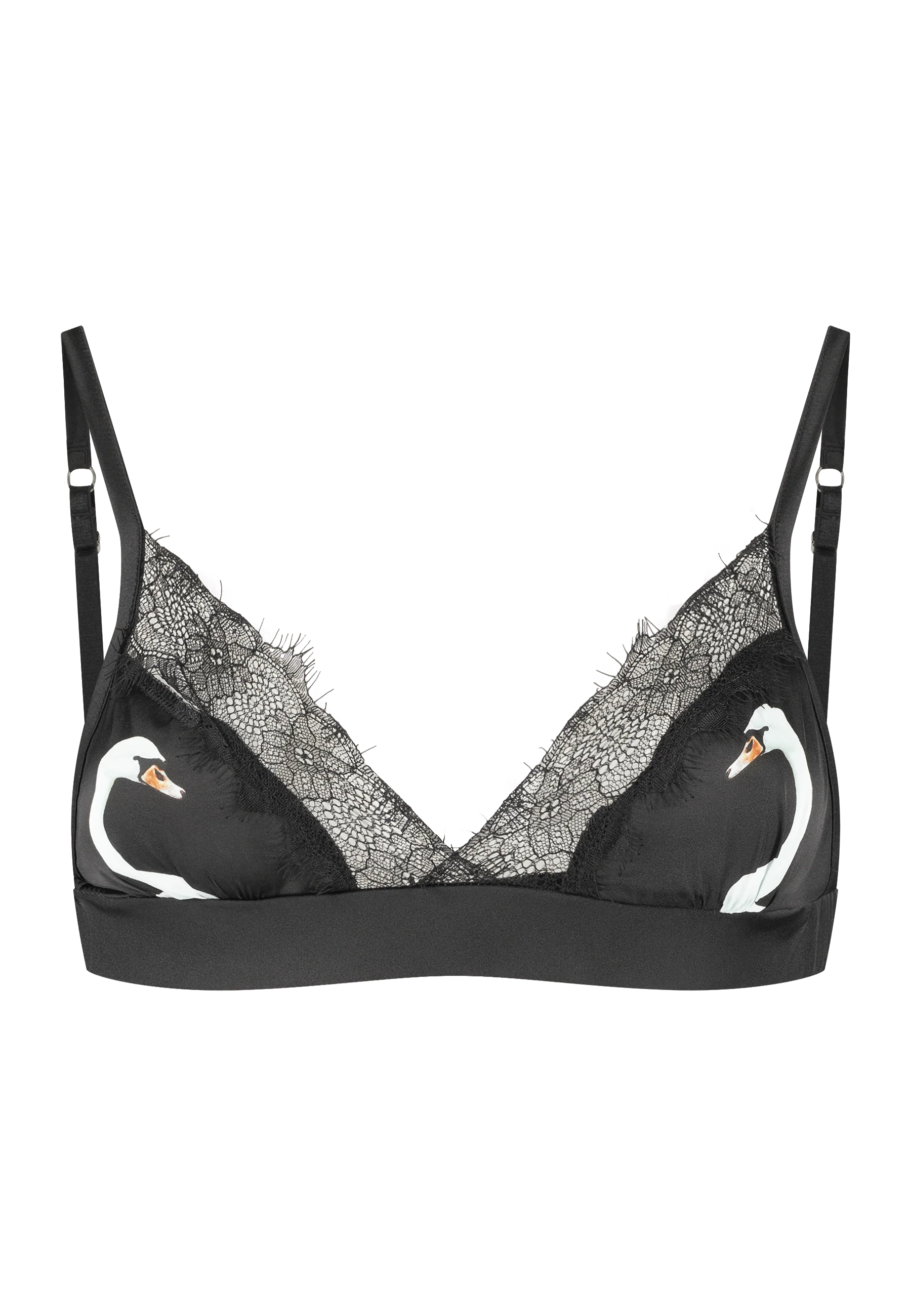 The Swan Lake Silk Lace bralette offers light support with a barely-there soft feel. Draped triangle cups flatter natural shape; a flexible underband supports without wires. Adjustable straps refine the fit with eye-catching eyelash lace that frames the neckline. Disappears under tees, layers under a satin camisole, and pairs with the matching string thong, or check out the Swan Lake Silk Halter Romper for a similar motif!